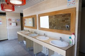 Sie können zwei Sanitärgebäude nutzen. Dort finden Sie WCs, Duschen, Entleermöglichkeit für Chemie-WCs, Waschbecken, Spülbecken für Geschirr, Becken zum Waschen von Wäsche, Haartrockner, Babybereich mit Wickeltisch und Badewanne, Kinder-WC, behindertengerechte Anlagen sowie eine Wäscherei mit 3 Waschmaschinen und 3 Wäschetrocknern, Bügeleisen und Bügelbrettern.