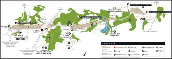 Um die verschiedenen Stätten besser zu bewundern und den Zugang zu erleichtern, wurden Wanderwege eingerichtet, die es ermöglichen, zu Fuß rund um die Ausrichtungsreihen von Ménec und Kermario zu gehen. Parkplätze, sanitäre Einrichtungen und Picknickbereiche sind vorhanden. Wenn Sie gerne spazieren gehen, führen Sie weitere Wege durch die Carnac-Landschaft zum Tumulus Saint Michel, dem Riesen von Manio, Kerlescan und dem Petit Ménec.