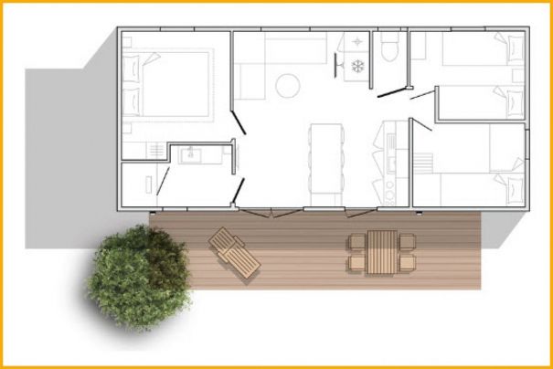 Dieses mobilheim "Privilège 3 Schlafzimmer" ist perfekt für eine Familie mit mehreren Kindern oder Freunde geeignet, die zusammen Urlaub machen möchten. Das Modell ist 35 m² für eine Familie mit mehreren Kindern oder für Freunde bestimmt, die wünschen, sich auf Urlaub wiederzufinden: mit seinen 3 Zimmer bietet er mehr Komfort und Intimität. Seine überdachte erhöhte Holzterrasse, die den Salon in Richtung der Außenseite vergrößern, bringt einen zusätzlichen Komfort.