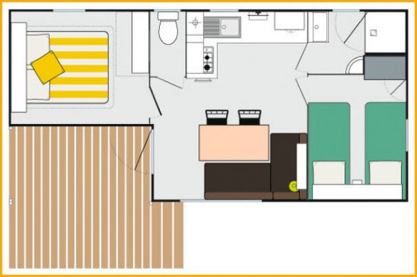Mit einer Fläche von 24 m² ist es mit 2 Schlafzimmern ausgestattet, die durch den Wohnbereich getrennt sind, sowie einer halbüberdachten erhöhten Terrasse. Verfügbar zur Vermietung pro Woche, für zwei Wochen oder am Wochenende (2 Nächte).