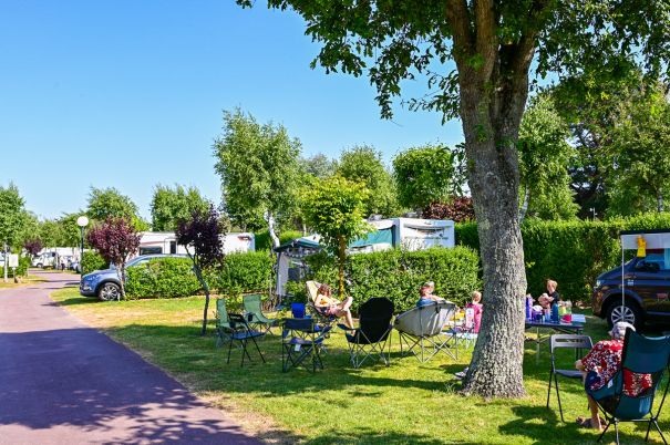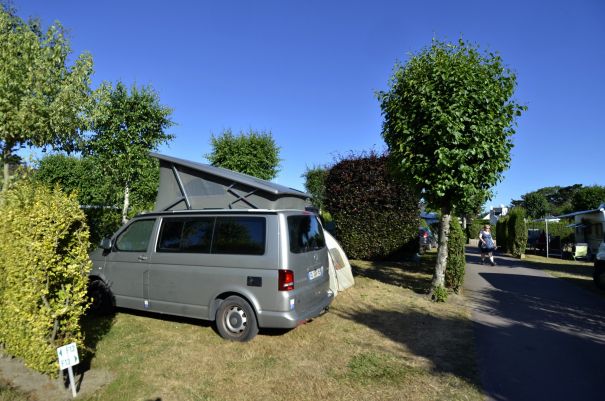 Ein großer Stellplatz von ca. 100 m² für 2 bis 6 Personen, umgeben von Hecken, die Ihre Privatsphäre schützen: Zelt, Wohnwagen oder Wohnmobil finden hier leicht ihren Platz.