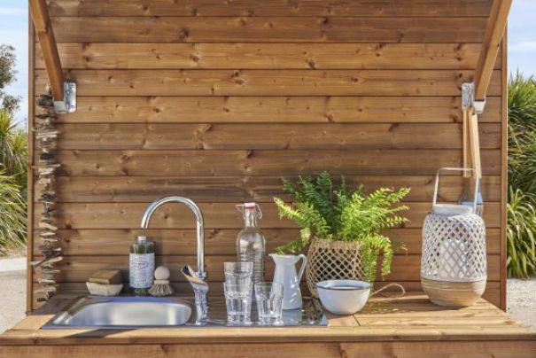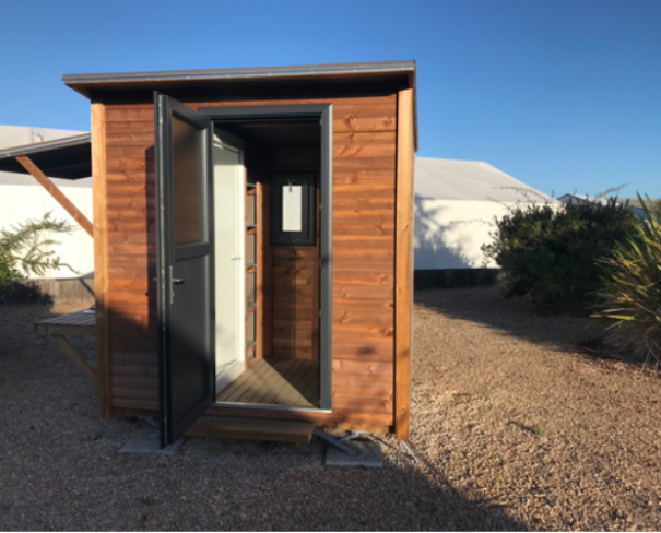 Der Stellplatz Serenity (100 m²) bietet Ihr eigenes privates Bad: WC, Dusche, Spülbecken und kleiner Kühlschrank. So genießen Sie echtes Camping – mit zusätzlicher Privatsphäre.