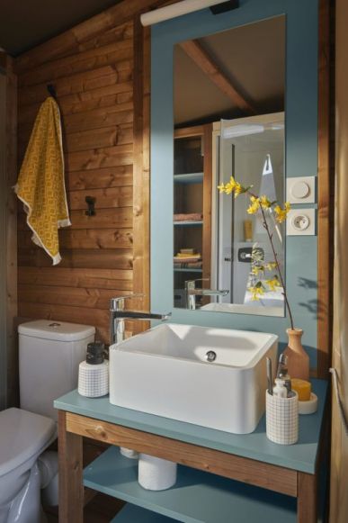 Schluss mit den vielen Wegen zu den Gemeinschaftssanitäranlagen: Sie genießen Ihr eigenes Bad mit WC, Dusche, Spülbecken und kleinem Kühlschrank, in dem Sie Ihre Getränke kühl halten können. Anschluss an Wasser, Abwasser und Strom inklusive – alles ist bereit für einen einfachen, reibungslosen und erholsamen Aufenthalt.